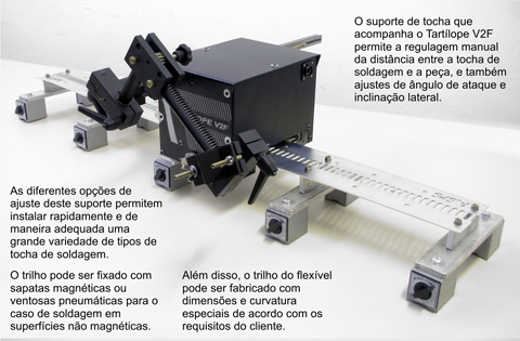 O Tartílope V2F é um manipular robótico que conta com todas as funcionalidades do V2, porém, utiliza trilho flexível que permite a fixação do equipamento em superfícies curvas, possibilitando a soldagem em tanques, cilindros, costados de navios, tubulações e outras superfícies com variação de forma.